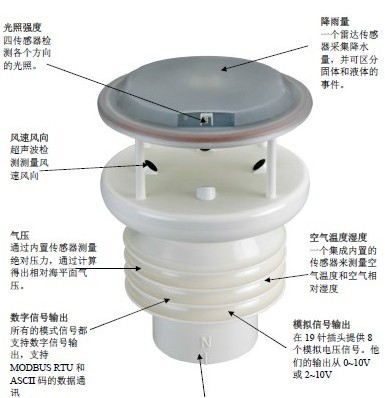 测量参数:风速、风向、空气温度(超声波测量)、空气湿度、气压、光照强度、降雨量。